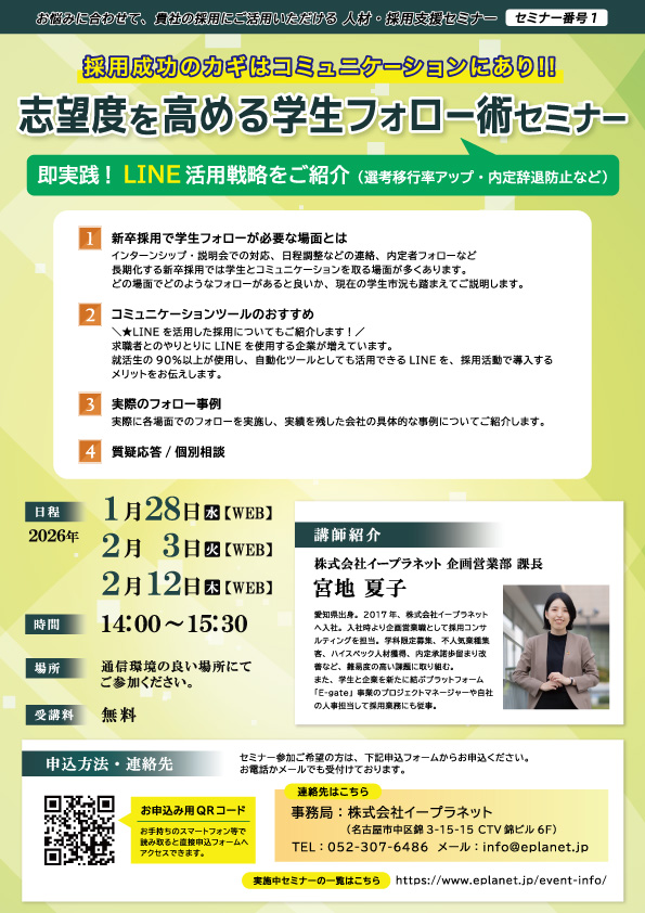2026年 2月13日(木)【WEB】時間 14:00~15:30 講師 株式会社イープラネット 企画営業部 課長 宮地夏子 1. 新卒採用で学生フォローが必要な場面とは